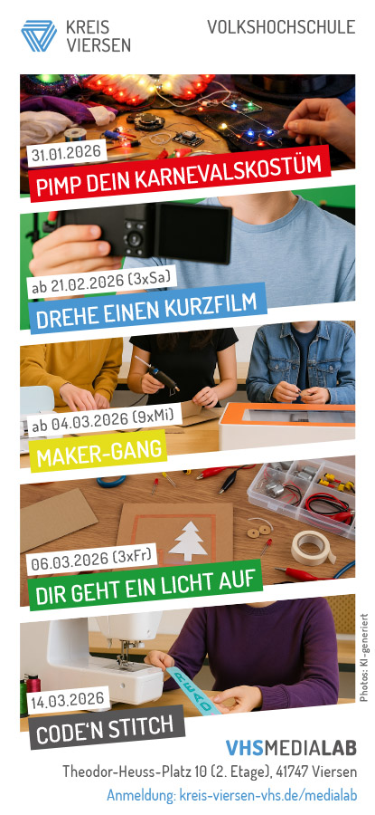 Das vhs MediaLab Kreis Viersen beginnt das Jahr 2026 mit fünf neuen Workshops rund ums kreative Tüfteln, Filmen und Programmieren. Jugendliche ab…
